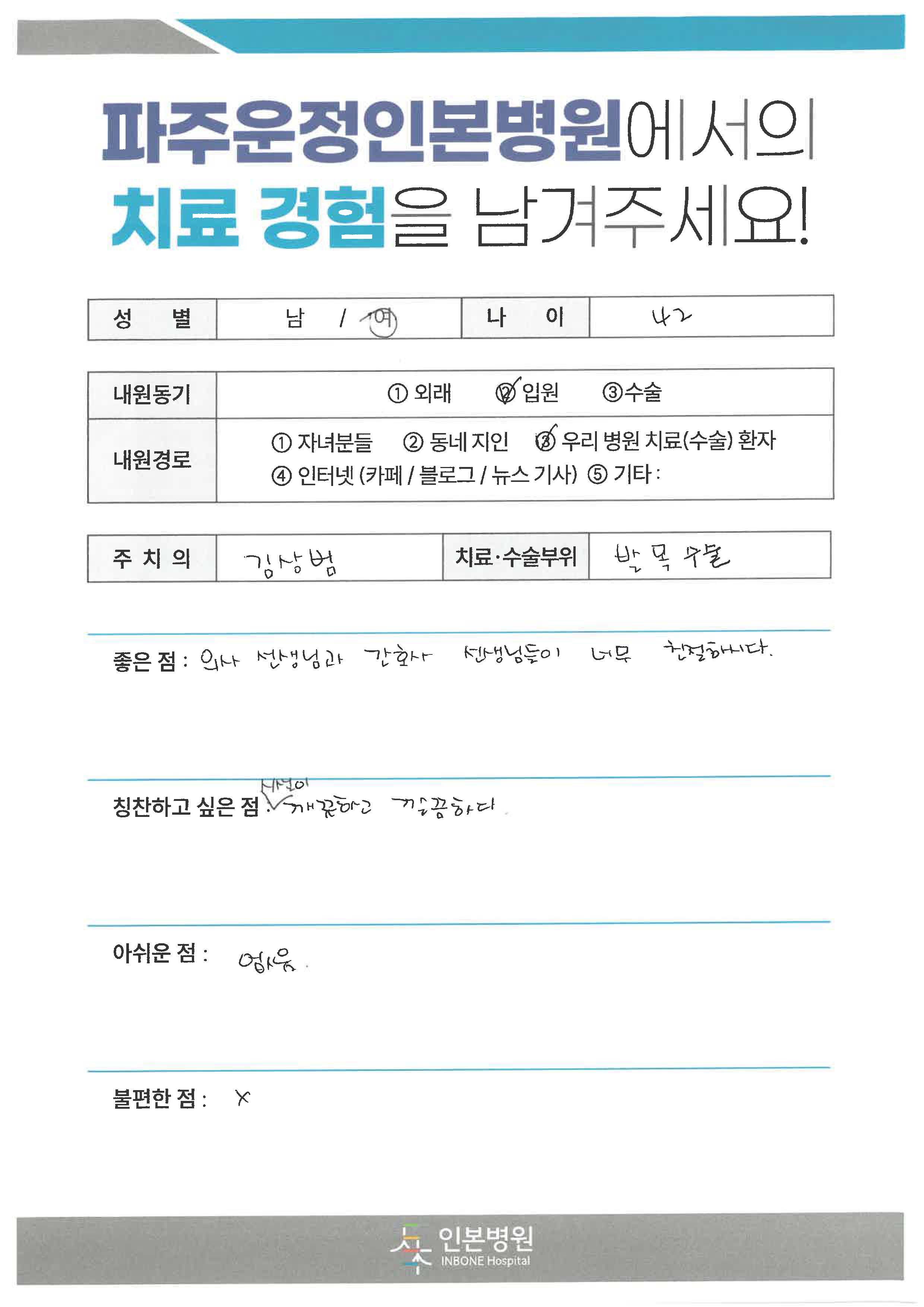환자분들이 인본병원을 방문하고 작성해주신 솔직한 치료후기를 확인해 보세요.