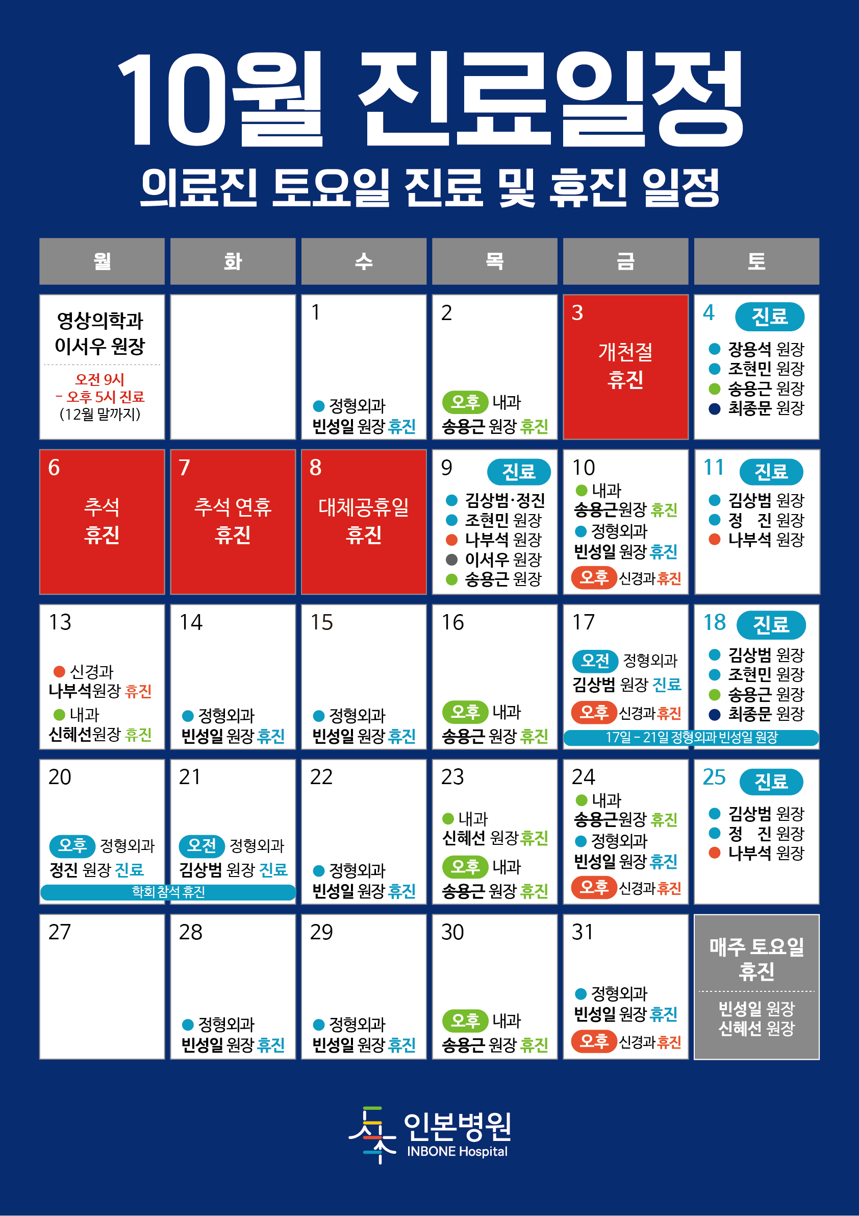 [인본병원 파주운정] 10월 진료일정 안내